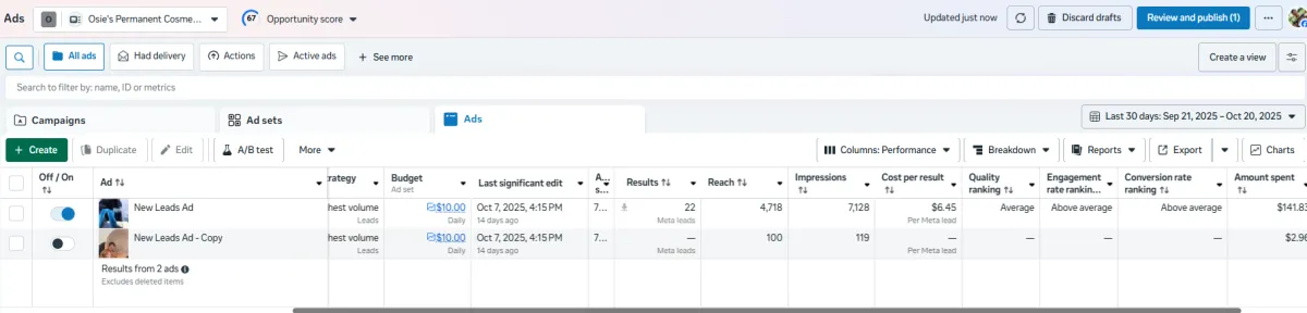 In just 14 days, the campaign generated 22 qualified leads at a $6.45 CPL, outperforming beauty industry averages ($15–$25).