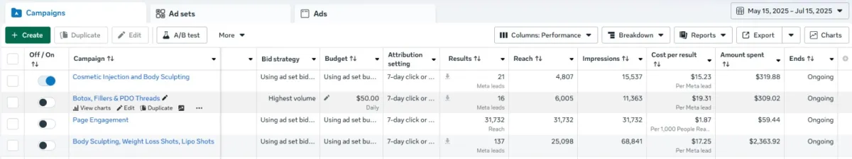 We launched Meta ad campaigns focused on Cosmetic Injections and Body Sculpting, Botox, Fillers, and PDO Threads, and Body Sculpting, Weight Loss Shots, and Lipo Shots. Each campaign was designed with unique offers and clear audience segmentation to maximize lead generation and service interest.